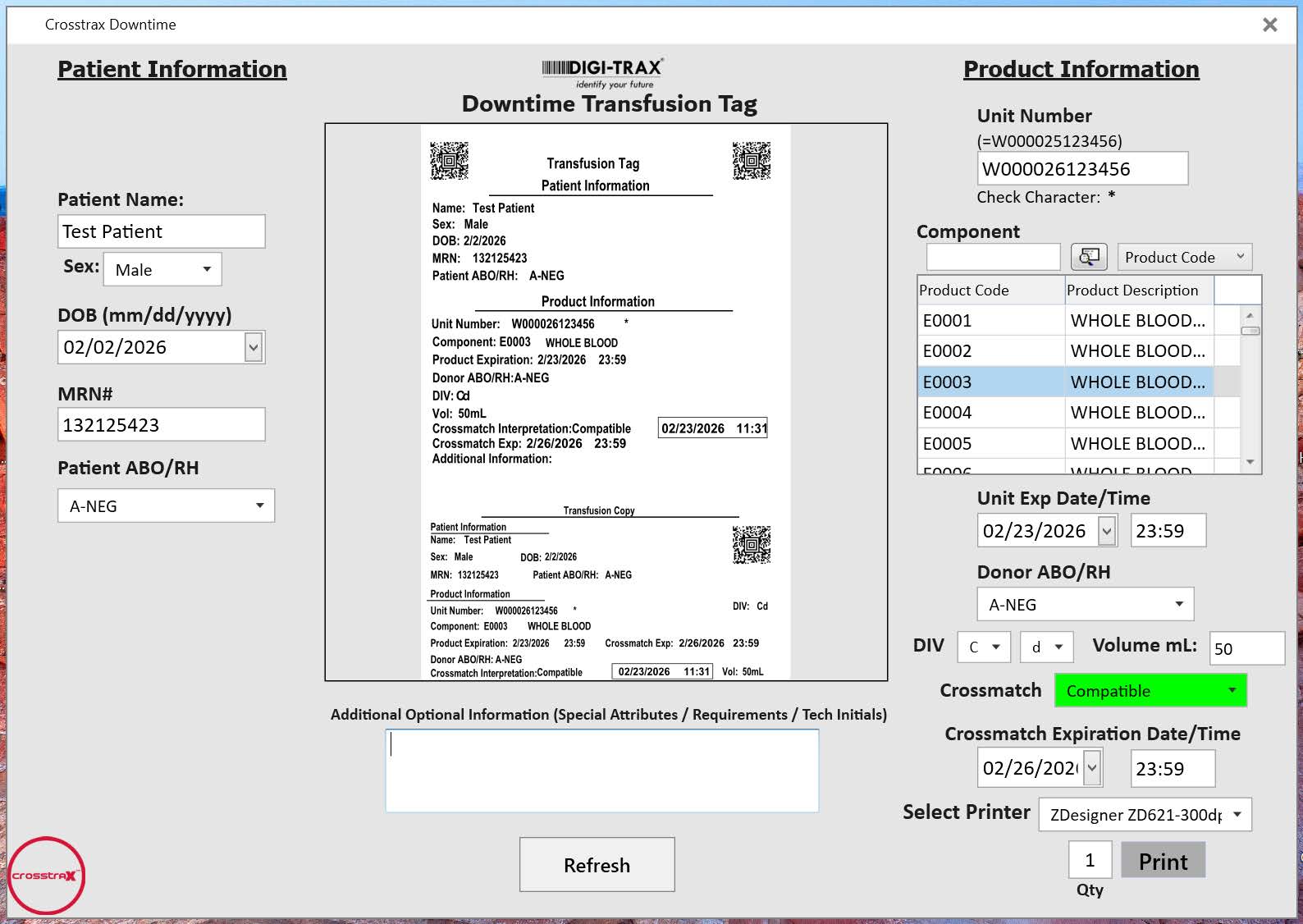CrossTrax™ DT is designed to reduce the risks and inefficiencies that come with manual downtime processes. By replacing handwritten labels with a streamlined, scannable workflow, it helps staff maintain safe and compliant transfusion labeling when primary systems are unavailable.