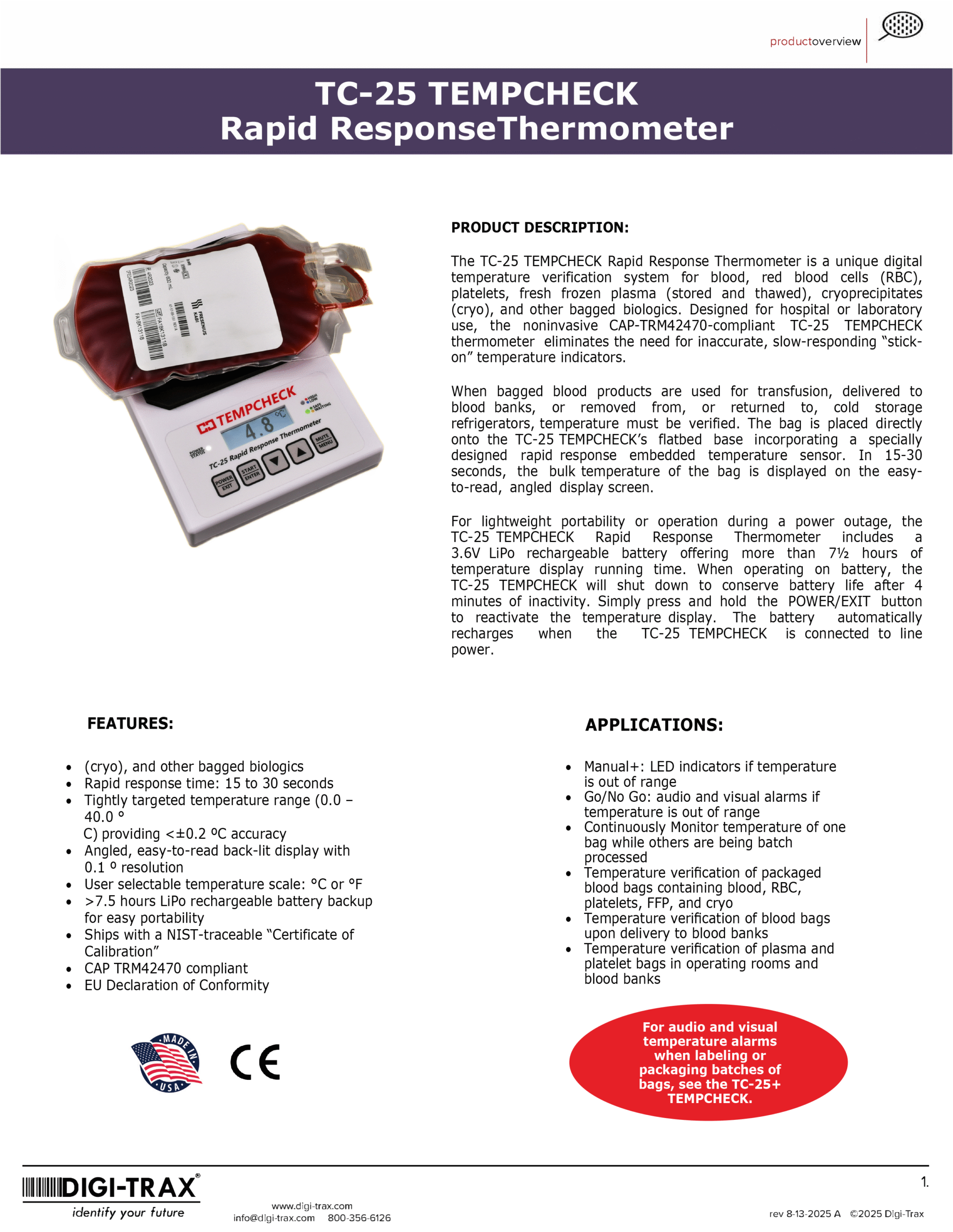 Ensure safe transfusions and regulatory compliance with TEMPCHECK rapid-response thermometers. These precision flatbed devices quickly verify the temperature of blood bags, plasma, red blood cells, cryoprecipitate, and other biological products. Trusted by hospitals, labs, and blood banks, TEMPCHECK systems help validate blood product temperatures in seconds to maintain quality and protect patients.